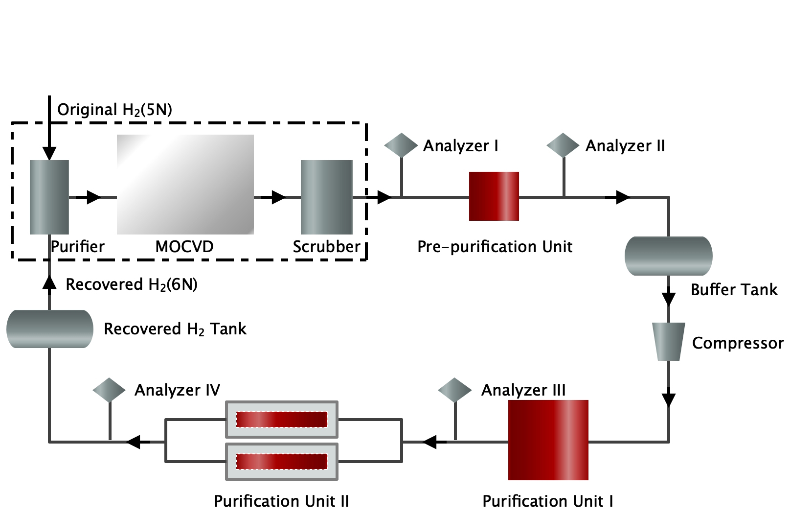 이 시스템은 전자 급 H2 부산물을 생산할 수 있 고 순도는 6N에 달한다.본 시스템 의 회수 효율은 90% 보다 낮지 않고 구체적인 절차 도는 오른쪽 과 같다.: