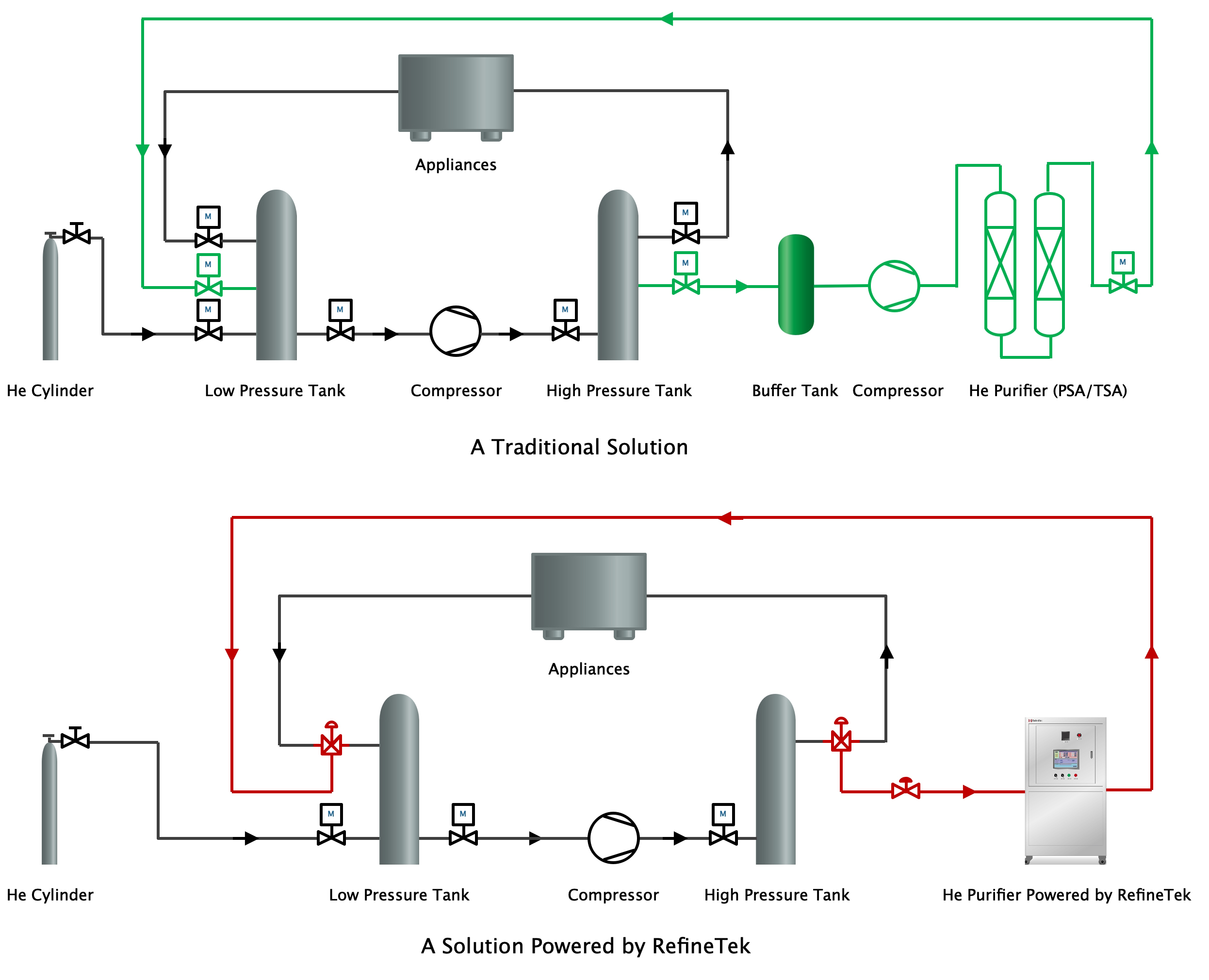 이 동시에 본 시스템은 최 제품의종류를 유연하게 선택 할 수 있다. 헬륨을 응용하지 않아도 되는상황에서 5N 급 헬륨가스를 얻은후에 최종제품으로 판매 할 수 있다. 전자급 H2 (6N 급) 는 부산물로 추가 판매 할 수 있다.
