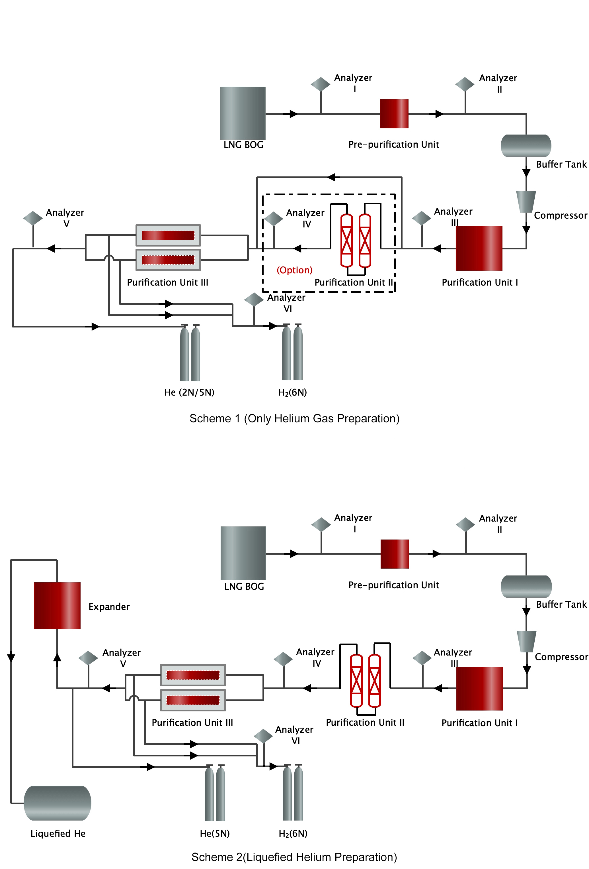 LNG 이완 (BOG) 배출구에서 액화 되지 않은증기를 본 시스템에 도입하고 선행순화 유닛 처리 후 1 급 순화 유닛에 진입한다. 검측을 통해 설정한 순도에 도달한후에 3 급 순화 유닛 (수소 헬륨 분) 에 들어간다.이) 헬륨 가스 가 2N (99%) 의 순도를 측정한후에 헬륨가스 제품으로 직접사용 할 수 있다. 5N 급 (99.99%) 이 필요하지 않은공업분야에 응용 된다. 예를들어 에어컨, 냉동, 보스, 광섬유 필라멘트 냉각, 반도체 웨이퍼 냉각 등 이다.