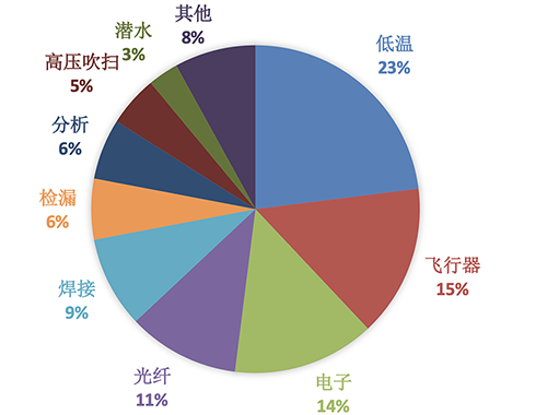 氦气具有很多特殊的物理和化学性质,最大的特性是具有极低的沸点4.2K(-268.9℃),部分材料在此温度下具有很多特殊的性质,例如超导,最大的应用是核磁共振NMR和医疗用的磁共振成像MRI。氦气分子非常小,非常轻,具有非常高的比热和导热性能,被广泛应用于气球、飞艇、检漏、气态冷却等应用领域。其次,氦气还具有很强的化学惰性,可被用作载气,应用于半导体和分析检测行业。此外,氦气还在尖端科学研究和核物理领域具有诸多不可替代的作用。总之,氦气是一种非常珍贵的不可再生资源,具有非常多独特的性质,应用领域广阔,对于部分领域具有绝对的不可替代性。据U. S. Geological Survey (USGS)数据统计,2017年氦气按应用领域分配如下图所示: