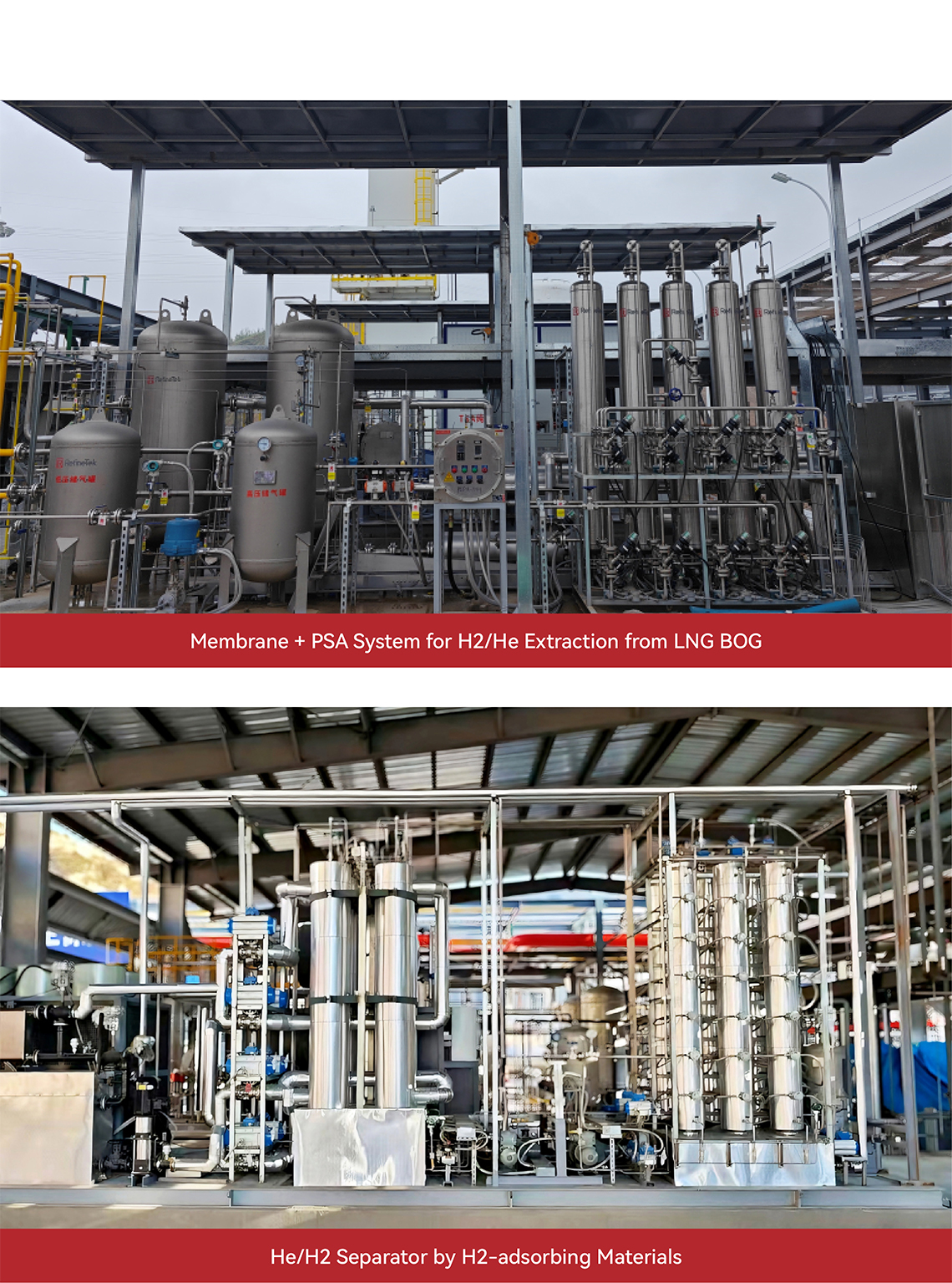 以LNG BOG为原料,将经过多重预处理和预纯化(包括并不限于除油、除水、低温分离纯化、复温、加压、干燥、脱碳等)后的含较高浓度的He/H2混合气,杂质为大量CH4和N2,经过膜分离提He/H2、PSA精制、合金He/H2分离、TSA精纯化等工艺分别去除He/H2混合气中的CH4、N2和Ne,分别提取获高纯He、高纯H2产品的装置。
